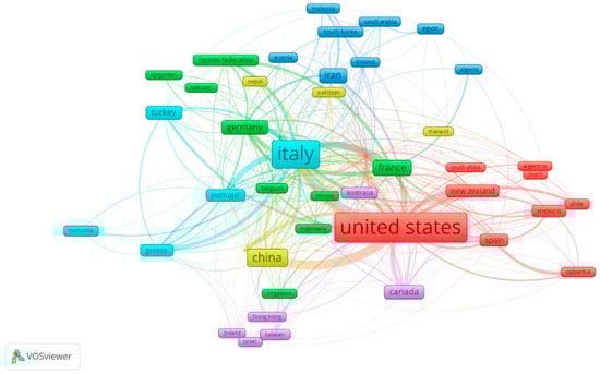 Contributions from all nations were significantly less between 2002 and 2022 than those from the US, Italy, China, the UK, India, Canada, and Iran. A total of 42 of the 106 nations released one to twenty articles, which is a moderate amount. The research is of the same calibre even when co-authors come from various countries. Rather, it offers perspectives on how nations and research facilities might work together productively to produce scholarly articles. A number of factors, such as the desire to diversify research areas, changes in funding patterns, an increase in human resources, and the difficulties presented by some experiments requiring specialised equipment, can be attributed to the rising participation in international collaborative research [29,30]. Based on an investigation using VOS viewer to look into co-authorship trends amongst countries, it was found that these countries have strong international ties. The need for research financing, information sharing, resource access, and the joint publication of research findings are the main drivers of this strong partnership.