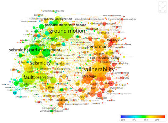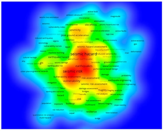 Researchers can learn more about their research interests and find pertinent connections by visualising and connecting the retrieved keywords. Figure 6 displays the density visualisation using keywords and the density of hotspots using the colour spectrum. Hot areas are indicated by warm red and cool areas by cool blue, respectively. Warm red denotes keywords with the highest frequency of usage, green represents keywords with moderate usage, and blue signifies keywords with the lowest frequency. “Seismic hazard”, “seismic risk”, “vulnerability”, “earthquakes”, “vulnerability assessment”, “seismicity”, “peak ground acceleration”, “seismic risk assessment”, “liquefaction”, “risk assessment”, and “fragility analysis” are keywords with the highest density.