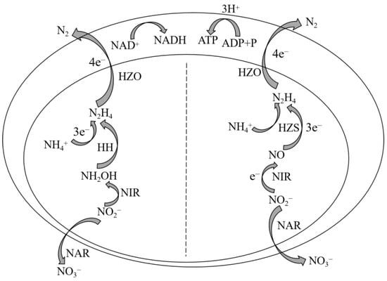 In recent years, the presence of nitrogen-containing pollutants in water has exerted a significant impact on the aquatic environment, making them the primary contributors to water pollution [1,2]. Biological nitrogen removal technology has gained significant attention due to its economic efficiency and mild operating conditions compared to physical and chemical methods for nitrogen removal. Extensive research has been conducted on the existing biological nitrogen removal technology for treating wastewater with low-concentration nitrogen and a high C/N ratio. However, the challenge lies in achieving efficient nitrogen removal from wastewater with a high concentration nitrogen and a low carbon-to-nitrogen ratio, which is crucial for effective water pollution control [3]. The anaerobic ammonia oxidation (Anammox) process is a cost-effective and highly efficient biological nitrogen removal technology utilized in wastewater treatment. It involves the anaerobic conversion of nitrite (NO2−-N) into nitrogen gas (N2) by specialized bacteria known as anaerobic ammonia oxidation bacteria (AnAOB), which utilize ammonia nitrogen (NH4+-N) as an electron donor under anaerobic or anoxic conditions (Figure 1). Compared to conventional biological nitrogen removal processes, the Anammox technology offers several advantages, such as reduced energy consumption for aeration, decreased organic carbon requirements, minimized sludge production, and improved economic viability. This emerging sewage nitrogen removal solution holds significant potential for replacing traditional nitrogen removal methods [4]. To date, a total of five genera of AnAOB have been identified, namely Candidatus Brocadia, Candidatus Kuenenia, Candidatus Jettenia, Candidatus Scalindua, and Candidatus Anammoxoglobus [5]. Bioelectrochemical systems (BES) combine electrochemical and biological methods, improving the drawbacks of biological methods such as a long start-up time, a low nitrogen removal rate, and the need for additional carbon sources. They also solve the problem of high energy consumption in electrochemical methods. Meanwhile, BES can generate electricity while achieving wastewater nitrogen removal treatment, reducing sludge production, and having advantages that traditional processes cannot match. It is an effective and economical nitrogen removal method. In recent years, the use of bioelectrochemical processes to treat nitrogen-containing wastewater has become a research hotspot [6]. Among all BESs, the microbial fuel cell (MFC) has obvious advantages and is widely studied [7]. MFC is a device that employs electrogenic microorganisms to catalyze the oxidation of pollutants in wastewater, thereby directly converting the chemical energy stored in the pollutants into electrical energy [8]. The commonly employed dual-chamber MFC comprises three components: an anode chamber, a cathode chamber, and a proton exchange membrane (PEM). The PEM serves the purpose of segregating the two electrode chambers while facilitating the transport of protons within the electrode chamber. Each of the two chambers contains an electrode, namely the anode and cathode, through which electrons traverse in the external circuit [9]. The electrochemical process of MFCs can be described as follows: Within the anode chamber, electricity-generating microorganisms proliferate and metabolize organic matter present in wastewater, thereby undergoing oxidation reactions that result in electron and proton release. Initially, electrons are transferred from intracellular electron transfer chains to microbial cell membranes before being conveyed to the anode via electron transfer mechanisms. Subsequently, these electrons are transmitted from the anode to the cathode through an external circuit, where they engage in reduction reactions with protons traversing through the PEM within the cathode chamber [10]. The utilization of MFCs for nitrogen removal in wastewater can be achieved under conditions with lower carbon-to-nitrogen ratios (C/N). Additionally, MFCs provide several advantages, including a diverse range of fuel sources, operation in mild conditions, less sludge production [11], high energy conversion efficiency, large volume load capacity, and environmental friendliness [4]. The integration of MFC with other sewage treatment technologies facilitates the simultaneous removal of pollutants and the generation of electricity.