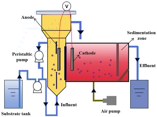 The electric field generated by MFC can enhance the activity of Anammox bacteria responsible for nitrogen removal. Moreover, the MFCs can utilize NH4+-N in the Anammox system as a fuel source, while their output voltage serves as an external power supply for the Anammox process [12]. Additionally, this coupled system facilitates various processes, including ammonia oxidation, Anammox, nitrification, and denitrification. Consequently, this integrated approach enables simultaneous removal of NH4+-N and NO2−-N from wastewater while generating electricity and minimizing carbon source addition and energy consumption. This renders it an economically efficient nitrogen removal process. The Anammox MFC integrates two energy-efficient technologies for wastewater treatment, thereby facilitating efficient nitrogen removal and enabling energy recovery. In recent years, the integration of MFC with Anammox has been investigated, and its performance has been evaluated through comprehensive testing and analysis.