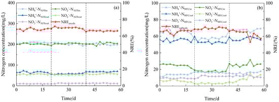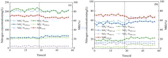 The performance of the reactor. (a) Anodic nitrogen removal effect. (b) Cathode nitrogen removal effect.