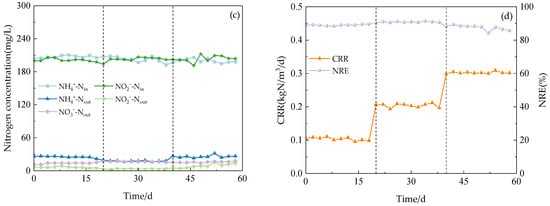 The performance of the reactor with continues operation. (a) Anodic nitrogen removal effect. (b) Cathode nitrogen removal effect. (c) Anammox AFB-MFC nitrogen removal effect. (d) COD load (CRR) and nitrogen removal efficiency (NRE).