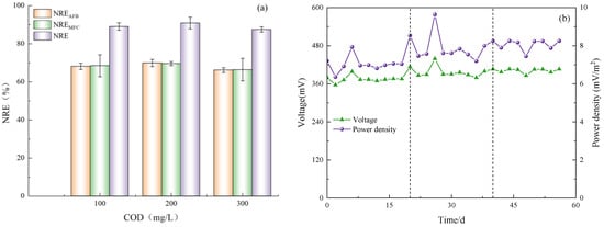 Nitrogen removal rate and electricity production performance. (a) NRE of anode (NREAFB); NRE of cathode (NREMFC); NRE of Anammox AFB-MFC (NRE). (b) Electricity generation performance of Anammox AFB-MFC.