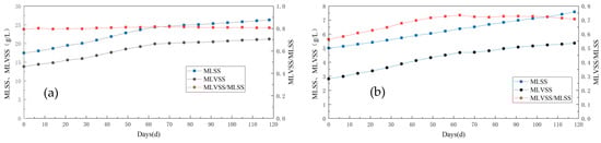 Variation in sludge concentration in the anode and cathode chamber of Anammox AFB-MFC. (a) MLSS and MLVSS in anode; (b) MLSS and MLVSS in cathode.