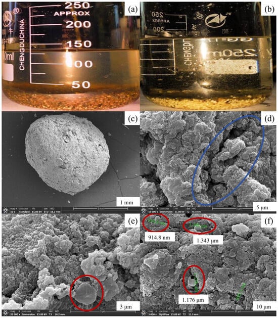 The overall morphology of the anaerobic bioparticles is depicted in Figure 7c. From the figure, it can be observed that the particle size ranges between 1 and 3 mm, exhibiting a spherical shape with some surface irregularities such as grooves, which facilitate microbial attachment (Figure 7d). The red circle in Figure 7e represents a spherical bacterium measuring approximately 1 μm in diameter, featuring a central depression that resembles a crater structure. This observation aligns with the previously reported morphology of AnAOB and thus suggests its potential identification as such. Furthermore, numerous spherical bacteria can be observed on the surface of bioparticles (Figure 7f), highlighted within the red circle, exhibiting diameters ranging from 0.9 to 1.4 μm, which is consistent with the defined size range for AnAOB. Therefore, these spherical bacteria are likely to be classified as AnAOB.