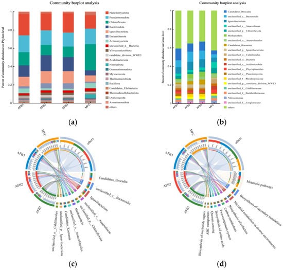 Anode bioparticles:AFB1 (lower), AFB2 (middle), AFB3 (upper), and MFC (cathode). (a) Microbial community distribution of Anammox AFB-MFC at phylum level; (b) microbial community distribution of Anammox AFB-MFC at genus level; (c) circos sample and species relationship diagram at genus level; (d) circos sample and function relationship diagram.