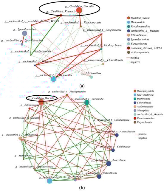 In order to facilitate a more comprehensive comparison and analysis of the relationship between microbial communities in the anode and cathode chambers, we established a correlation network (Figure 9). The top 30 species were selected with the highest abundance for analysis. AnAOB was highlighted within a black box, with Candidatus Brocadia represented by a larger circle indicating higher abundance and Candidatus Kunenia represented by a smaller circle. In Figure 9, AnAOB exhibited a significant positive correlation with Planctomycetota and Ignavibacteriota while showing negative correlations with Pseudomonadota, Actinomycetota, Chloroflexota, and Nitrospirota. The coexistence of electricity-producing bacteria in Ignavibacteriota and AnAOB could potentially explain the synergistic effect between nitrogen removal and electricity production in the system. The presence of abundant AnAOB on the anode surface might inhibit the growth of other nitrogen-related bacteria, such as Actinomycetota with nitrogen-fixing ability. Additionally, Nitrospirota, as a typical NOB, displayed a negative correlation with AnAOB. Microbial correlation networks for both anode and cathode revealed that AnAOB was present in both polar chambers, particularly Candidatus Brocadia showed potential mutual promotion with electricity-producing bacteria but had a negative correlation with NOB.