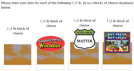 Marbleized cow’s cheese was chosen for this study as it is readily available in the marketplace featuring the regional logos and mileage cutoffs being investigated, and is a familiar product in the region that is available year-round. Participants were told they would be given USD 15 to use in the auctions, which was also the maximum they could bid in any one auction. Participants were paid USD 25–32 in cash, minus any cheese won, at the end of the session. They were also informed they would participate in several auctions, although only one would be binding. Thus, they could purchase at most one block of cheese with their USD 15.