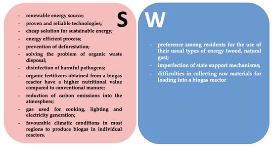 State support can simplify obtaining a loan for a biogas plant. We conducted a SWOT analysis to assess the advantages and problems of the installation and operation of biogas plants, which will help to understand whether the state should support their implementation.