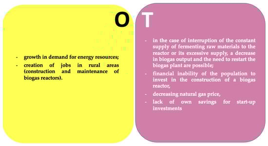 External factors of biogas SWOT analysis. Source: Malik et al., 2020 [29]; Shkarivska et al., 2020 [30]; Shpychak et al., 2015 [31]; Tokarchuk et al., 2020 [32].