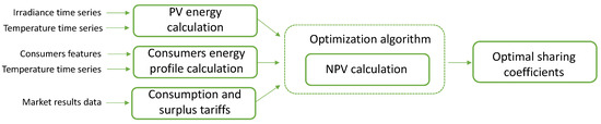 The following lines briefly introduce the modeling of each of the auxiliary routines that will feed the economic calculation module. Likewise, the procedure for calculating the default sharing coefficients currently in force in the Spanish regulations (i.e., the non-optimized approach for sharing self-consumption energy) are also briefly described. Finally, the procedure for the economic evaluation of the potential solutions obtained by the optimization algorithms (i.e., the objective function) is introduced in Section 3.