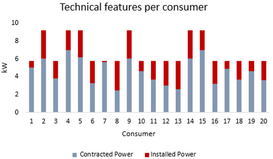 In this work, a collective self-consumption installation was considered in a residential building located in the city of Seville (37°21′57″ N 5°58′59″ W). The building consists of a total of 20 apartments with a contracted power in the range of 2.6–7.0 kW and an installed power between 5.75 and 9.2 kW. Figure 3 shows the technical specifications associated with each consumer.