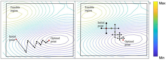 The multiple local searches based on interior-point method consists of a tool that allows us to find multiple local solutions indicated by the user on an optimization problem through a defined algorithm of choice. When executed, it allows us to initialize the sequence through the previously configured starting points. This is particularly practical when combined with a local search method, such as the interior-point method [29]. The search process, considering a minimization problem, is shown schematically in Figure 4 (left). The dots represent the different solutions attempted by the algorithm during the search and the arrows show the search direction.