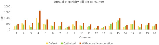 Figure 5 shows the electricity bill of each of the consumers participating in the self-consumption community under the following assumptions: (i) taking into consideration the default sharing coefficients established in the current regulatory framework, (ii) optimized coefficients (obtained through the multi-start approach, since it was the one that provided the best results) and (iii) under the original assumption before the installation of the self-consumption system. As can be seen, the installation of the PV panels resulted in noticeable savings for all consumers, under both the default and the optimized approaches. When comparing the results of the optimized approach with the default approach, it can be seen that most of the consumers obtained a reduction in their electricity bill. Among the consumers who saw their bill reduced by the optimized approach, it is worth highlighting consumer 4 (the one with the highest consumption in the original situation) who saw their bill reduced by 30%, with respect to the default approach, while most of the remaining consumers obtained savings, albeit in smaller amounts. However, it should also be noted that some consumers saw their electricity bill increase in the case of the optimized approach, compared to the default approach. This is due to the fact that the objective of this work was to maximize the overall economic profit of the whole; therefore, certain consumers may have seen their savings increase, to the detriment of others, in the search for the overall optimum.