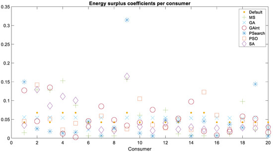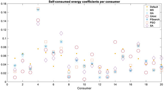 Figure 6 and Figure 7 show the allocation coefficients for each of the consumers using the default approach and the optimized approach by each of the tested algorithms for the individual allocation of self-consumed energy and surplus, respectively (please note that, for the sake of clarity, the coefficients represented in Figure 6 and Figure 7 are provided in table format in Appendix A).