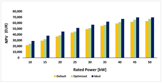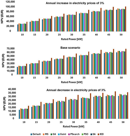 Table 5 shows the improvement to the default approach established in the regulation, according to Equations (3)–(5) in terms of NPV, using the different algorithms proposed (please note that the results shown correspond to the best solution after 10 independent runs of each algorithm; the reason for running each algorithm several times lies in the stochastic nature of the metaheuristic algorithms, which do not always provide the same solution, although they do provide a sufficiently good solution close to the global optimum). In addition, the increment associated with the ideal approach is presented, according to whether the set of consumers that constitute the self-consumption community behave in the same way as if they were a single consumer, so that the distribution is optimal and all the self-consumed energy is distributed among the members of the community.