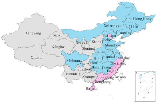 China’s regional grain division. Provinces in blue (magenta, light gray) colors are included in MPA (MCA, BA), respectively. Provinces in white color represent Hong Kong, Macau and Taiwan that were excluded from this study.