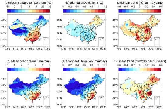 Climatological mean state, standard deviation, and linear trend of (a–c) annual mean surface air temperature () and (d–f) annual mean precipitation (), based on the CN05.1 gridded observation dataset for the period of 2002–2021.