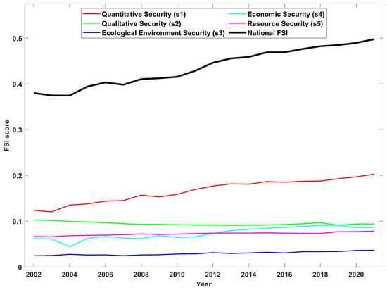 Variations in national mean food security index () and the subsystem indicators during 2002–2021.