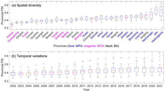 Boxplot of the provincial across dimensions of (a) space and (b) time. Provinces in blue (magenta, black) in (a) are included in MPA (MCA, BA), respectively. Red ‘+’ individual markers outside the whiskers of the box represent extreme values within the dataset.