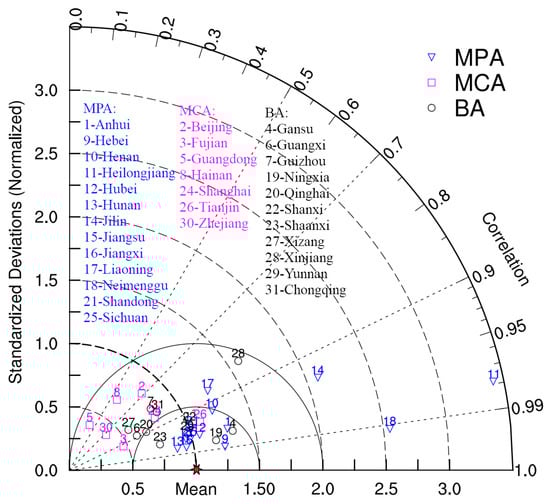 Taylor diagram for evaluation of diversity of provincial . The angular distance from the x-axis denotes the temporal correlation coefficient between each provincial and the national mean . The horizontal axis denotes the ratio of standardized deviations between the provincial and the national mean , which is marked as a red star on the x-axis. Provinces in blue (magenta, black) are included in the MPA (MCA, BA), respectively.