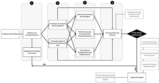 Figure 3 clarifies the fundamental idea of iterative advancement inside the framework. After the identification phase begins, the process proceeds into the ideation and conceptualization stage, which is mostly dependent on meticulous simulations and analysis. These ongoing iterations, which emphasize data-driven building morphology, performance, environmental considerations, and user-centric innovations among other variables, are continuously informed by these inputs and tailored to correspond with the study objectives [