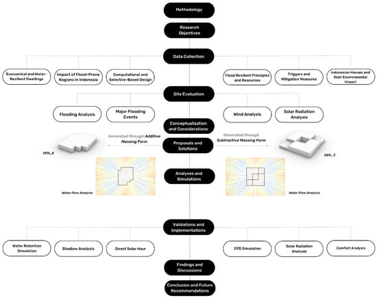 3]. To help its citizens—especially the disadvantaged—adapt to various shocks and stressors, a resilient city—one that can bounce back from setbacks and maintain operations—is essential. Consequently, this paper advances the conversation by investigating how computational design might improve resilience in regions that are prone to flooding. Ultimately, this is achieved by introducing an atypical strategy developed into a flexible framework in which building typology serves as a trigger for the early integration of computational methodologies into design. The framework ensures a smooth multidisciplinary process that not only aids in developing a mitigation strategy against flooding but also ensures possible adaptations for sustainability measures and high user comfortability levels. Furthermore, this article attempts to build practical flood risk mitigation measures by computationally simulating a variety of house morphologies. Then, a case study is selected to test the viability, efficiency, and flexibility of the framework by analyzing a set of generated typologies. By allowing for ongoing iterations, evaluations, and modifications based on the initially identified data as well as feedback and performance assessments, the proposed framework thus seeks to accommodate various design optimization-based approaches while guaranteeing that the final design satisfies the intended objectives and criteria. The evaluation of these morphologies’ viability as affordable, water-resilient, and sustainable living spaces in Semarang, Indonesia, is made easier by this novel use of computational analyses and real-life contextual simulations [