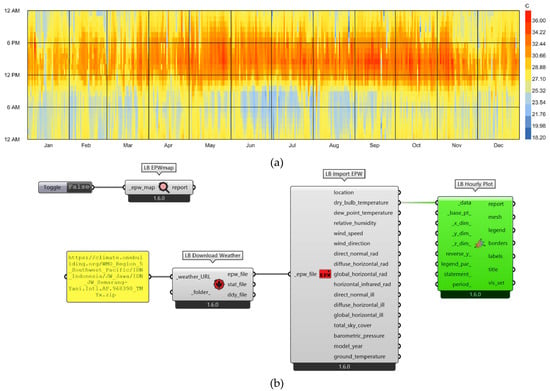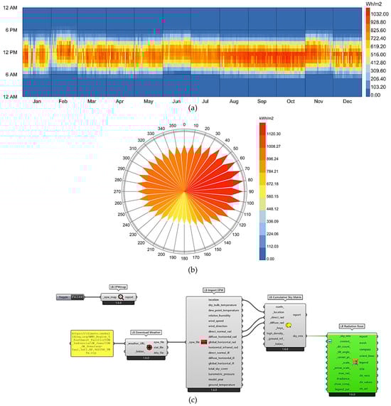 Figure 8c presents the script detailing the necessary components for the ladybug code, including the location file for the weather map. Thus, this thorough study of solar radiation provides insightful information about Semarang’s solar radiation distribution and intensity, facilitating well-informed decision-making for a range of uses.