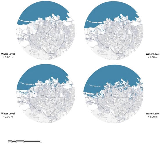 Figure 10 highlights the rising tendency of land submersion at different sea levels. Even though the maximum water level ever recorded is just around two meters [