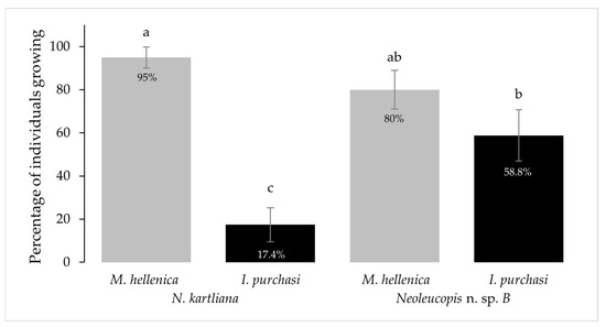 Bar plot of the percentage (means ± SE) of N. kartliana (left) and Neoleucopis n. sp. B individuals (right) growing when provided only the non-target scale insect (I. purchasi) (black bars) and only the target scale insect (M. hellenica) (grey bars) as food sources during prey specificity experiments. Error bars denoting standard error are incorporated, and significance levels are indicated. Means denoted by the same letter are not significantly different (Tukey’s HSD test at p = 0.05).