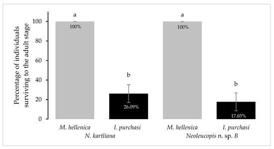 Bar plot of the percentage (means ± SE) of N. kartliana (left) and Neoleucopis n. sp. B individuals (right) that survived to the adult stage when provided only the non-target scale insect as a food source (I. purchasi) (black bars) and only the target scale insect (M. hellenica) (grey bars) during prey specificity experiments. Error bars denoting standard error are incorporated, and significance levels are indicated. Means denoted by the same letter are not significantly different (Tukey’s HSD test at p = 0.05).