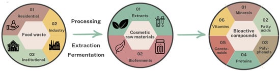 It is well-recognized that the cosmetics industry needs functional and sustainable ingredients from renewable sources [7,10]. Consumers are looking for products made of renewable and bio-based ingredients which are commonly considered to be non-toxic and biodegradable. Meanwhile, the food industry produces a large amount of food waste, which ends up in landfills, participating in the global emission of carbon and anthropogenic methane and contributing to the development of global warming [5,11]. However, this waste has a large potential to be used in the cosmetic industry as a raw material rich in antioxidants, polyphenols, proteins, minerals, vitamins, carotenoids, lignans, polysaccharides, natural-derived polymers, and other substances (Figure 1). Eliminating waste from the food industry and turning it into valuable products became a necessity to save natural resources and avoid methane and carbon dioxide emissions, thus helping to boost a circular economy [12].