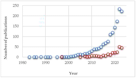 Scopus search results from the title, abstract or keywords with “cosmetic” AND “fermentation” (blue) compared with “cosmetic” AND “fermentation” AND “waste” (red).