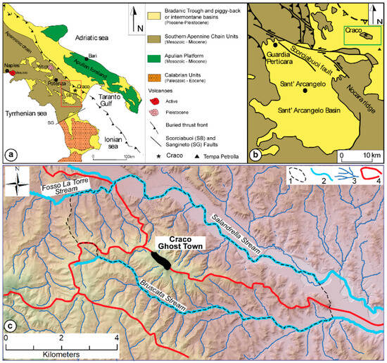 Location of the study area (a) within the Southern Apennine Chain, (b) relative to the Sant’Arcangelo basin, and (c) within the hydrographic network. The red rectangle in (a) indicates (b)’s boundaries. The green rectangle in (b) indicates (c)’s boundaries. Legend in (c): 1 Craco Compound Geomorphosite; 2 main stream; 3 hydrographic network; 4 surface watershed. Note that in (b) just the bedrock deposits (Apenninic units) are represented for the study area, and not the Pliocene ones, in order to emphasize its structural asset.