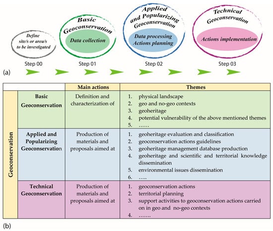 (a) Flow diagram showing the steps involved in the process. (b) Main actions and themes in Basic, Applied and Popularizing, and Technical Geoconservation. Themes can be expanded based on site’s characteristics, indicated by ellipses (…).