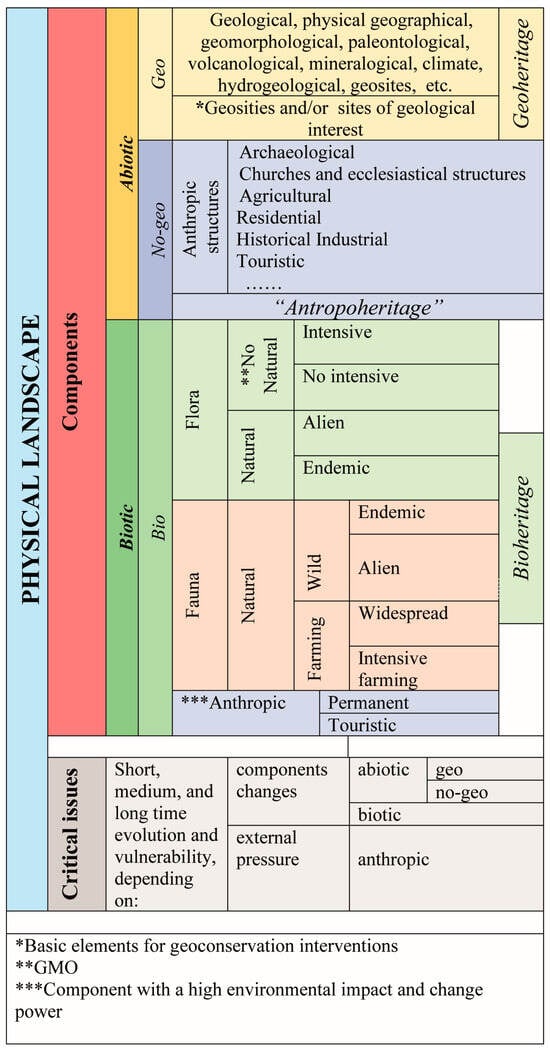 Physical landscape (PL): Components and main critical issues. Geosites are considered from a general point of view, as belonging to the PL’s abiotic component geo context, then from a detailed point of view, as basic elements for geoconservation interventions. The anthropic aspects are considered as belonging (i) to the abiotic component (anthropic structures) and (ii) to the biotic component; in both cases, they are considered as components with a high environmental impact and change power on PL. Note that the list of Anthropic structures is not exhaustive and can be expanded based on the site’s characteristics, indicated by ellipses …