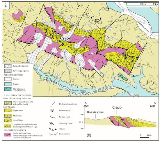 (a) Geological map of the Craco area and (b) cross-section highlighting the main tectonic and stratigraphic features.