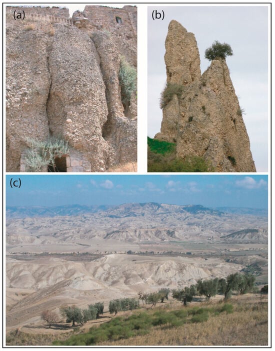 (a) Fractured conglomerate vertical walls; anthropic cavities are present at the base of the walls and, towards the top, houses are built on them; (b) conglomerate peaks; (c) badlands.