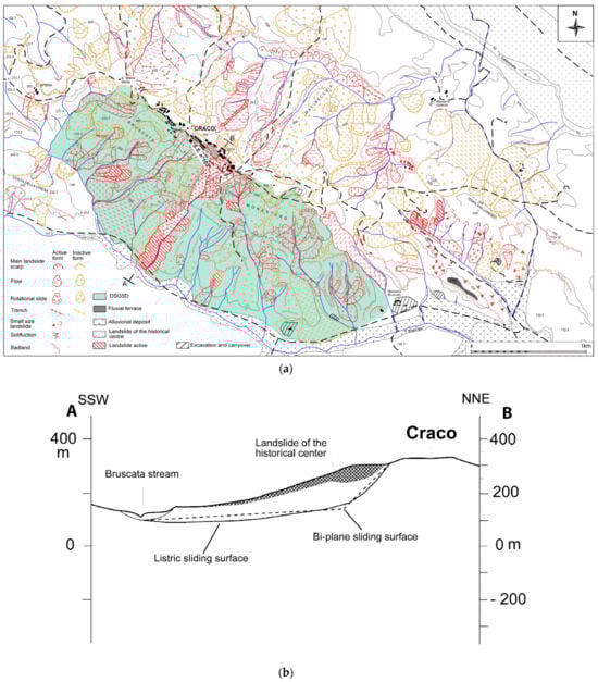 (a) Landslides map of the Craco area, the direction of cross section in (b) is shown by the A-B profile; (b) geomorphological cross-section along the south-western slope.