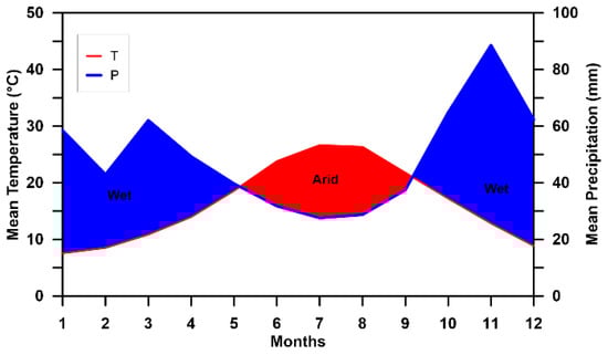In order to frame the current climate of the area, the data of the Craco Peschiera (40°22′ lat and 16°50′ long) thermal–pluviometry station of the Sistema Agrometereologico Lucano (Lucanian Agrometeorological System) network was taken into account (Figure 9). The thermal–pluviometry set covers a 23-year period, from 2000 to 2023. The average annual temperature fluctuates around 14.3 °C. January is the coldest month, with an average temperature of 7.4 °C; August is the hottest month, with an average temperature of 25.5 °C. Average annual rainfall is 513.9 mm. The pluviometric regime is sub-equinoctial, almost Mediterranean, with an absolute maximum value of 66.7 mm in November, a relative value of 50.2 mm in March, and a minimum value of 14.6 mm in July. The aridity index value of De Martonne (ia) was equal to 20, identifying a sub-humid/semi-arid Mediterranean climate. It creates stational conditions suitable for the creation of formations on the boundary between the “prairies” and “scrubland” types. The analysis was deepened by calculating Emberger’s pluviometric quotient (q2), which represents the overall drought in a Mediterranean climate. The calculated quotient’s value (62.32) outlined that the station belongs to the sub-humid Mediterranean climate, whose limits lie between 50 and 90, according to the author’s classification. Inserting the obtained q2 value in Nahal’s climate diagram, and relating it to the value of the coldest month’s average minimum temperature, led to the conclusion that the bioclimate is mainly xeric, proving to be semi-arid and temperate. In order to complete the climate framework, the Thornthwaite humidity index (1948) was calculated. The obtained value (hi = −36) identifies a clearly xerothermic type of climate.