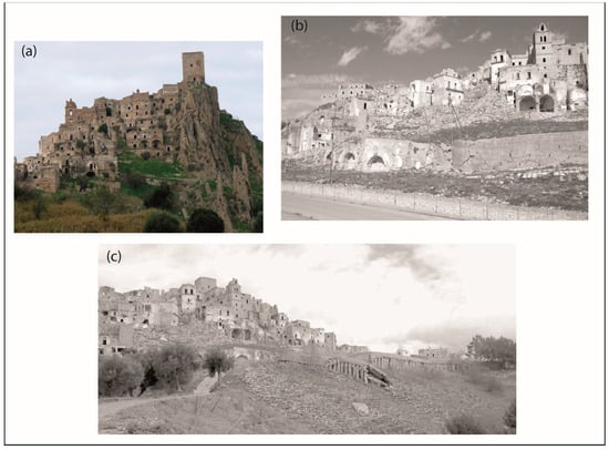 The urban generating nucleus of Craco developed around the Norman tower (Figure 10a), built in the 12th century on top of the hill, on an area characterized by good geological–geotechnical features, as proven by the fact that it would not been affected by landslides occurred in the 20th century. In the Middle Ages, the habitation site and the tower were already visible landmarks, as is mentioned in the travel diary of the Arab geographer Idrisi, who visited or simply observed them in 1154. The urban layout most probably underwent an expansion in the 13th century, a period in which around 400 inhabitants lived there, as can be seen from the focal taxation of 1277, which reports a number of 83 tax ‘fires’. The urban design of this period is characterized by a circular annular morphology, as a result of a construction choice to adapt to the topographical features of the hillside. The most important demographic development took place in the 16th century, during which there was an increase in the population to about 2500 inhabitants in 1561, which is why the settlement expanded downwards, reaching the present Largo Garibaldi and Largo Alighieri, continuing along Via Pinelli and Via Filangieri. Summarizing, from an architectural point of view, Craco is the result of historical sedimentation, of which it is possible to recognize the following: (i) a medieval core (11th–14th century) as evidenced by construction elements from this period; and (ii) an expansion between the 16th and 17th centuries, during which the great noble palaces, such as the Grossi Palace and Maronna Palace, were built: the former overlooking the small square where the Mother Church stands, the latter located next to the medieval tower and characterized by a monumental brick entrance, surmounted by a large terraced balcony. Subsequent urban expansions were carried out between the 18th and 19th centuries, as evidenced by the stylistic features found in some buildings. The rest of the building heritage is not influenced by stylistic currents. It is a vernacular Mediterranean architecture that blends in with the striking natural environment characterized by clay gullies and caves, as can be found in many other villages of medieval foundation in Basilicata.