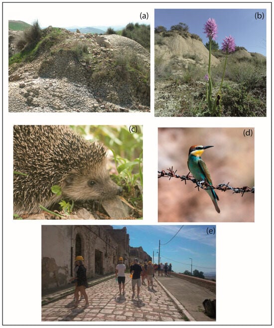 (a) Lygeum spartum and Camphorosma monspeliaca; (b) Orchis italica; (c) Erinaceus europaeus; (d) Merops apiaster. (Dr. V.A. Romano private archive photo, courtesy of the Author). (e) Craco represents a destination for educational excursions of geological sciences degree courses and secondary education schools involved in several projects.