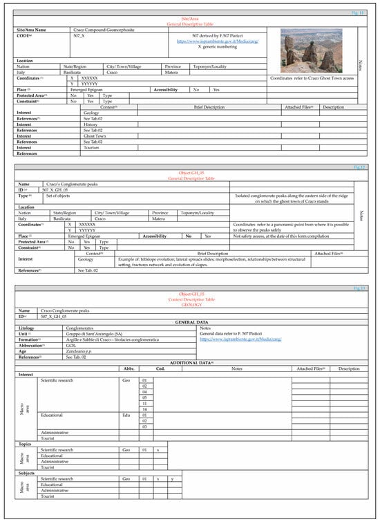 It is trivial that a site/area can be included in one or more territorial administrative areas, and it may contain within it one or more objects of interest; we call them objects generically—they could be objects of geological or biological or architectural interest or any other interest. The Feature Descriptive forms consist of a General Descriptive form on the location (Figure A2), and of specific descriptive forms developed according to a specific interest context as reported in Table A1. The latter will be processed with General and Additional Data Descriptive forms and with eventual topics and subjects developable in the four distinct macro-areas. For instance, the form related to the General Descriptive Table and Additional Descriptive Table for the Geology Context (Figure A3) and the form related to the General Descriptive Table for the Anthropic Building Context (Figure A4) are presented. These tables display the prototypes of the forms that will be used, along with their encoding, which identifies their contexts and the main topics and subjects. They are still prototypes under development, and they will be remodulated according to the difficulties in compiling them and to the need to make them as general as possible. Textual contents, photos, and videos will be associated with the tables, organized according to different levels of detail.