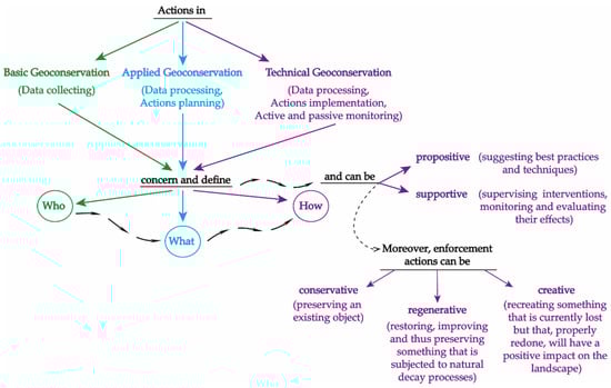 The Craco Compound Geomorphosite (Figure 1c) contains the Craco Geosite, included in the ISPRA National Italian Inventory of Geosites (http://sgi.isprambiente.it/geositiweb/default.aspx 15 October 2022) and in the Basilicata regional catalogue of geosites (https://rsdi.regione.basilicata.it/geositi/ watched on 15 October 2022). Table A1 provides a list of the main cultural contexts here available: the green-colored ones represent the contexts discussed in this paper. According to [39], several steps, including Basic Geoconservation, Applied and Popularizing Geoconservation, and Technical Geoconservation, characterize the study of this area. The main topics of each step covered by the study are summarized below. Topics will be intentionally condensed as much as possible, in order to provide a global idea of the procedure and its application. Figure 3 schematizes the main actions of the three geoconservation fields discussed in this paper. In this paper, Basic Conservation actions refer both to geo and non-geo contexts; Applied and Popularizing Geoconservation actions and Technical Geoconservation mainly refer to the geo context. Generally, programmed actions can (1) directly—and materially—concern the geoconservation of an object or an area, and/or (2) indirectly contribute to conservation and an increase in knowledge through dissemination. What follows will merge into a dedicated website and will be available to the final users, who may choose which content to view, according to their needs.