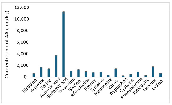 Figure 1. Total amino acid content (mg/kg) of apple pomace. Amino acid composition results are expressed as mg/kg of sample; all values are means ± standard deviation, n = 2.