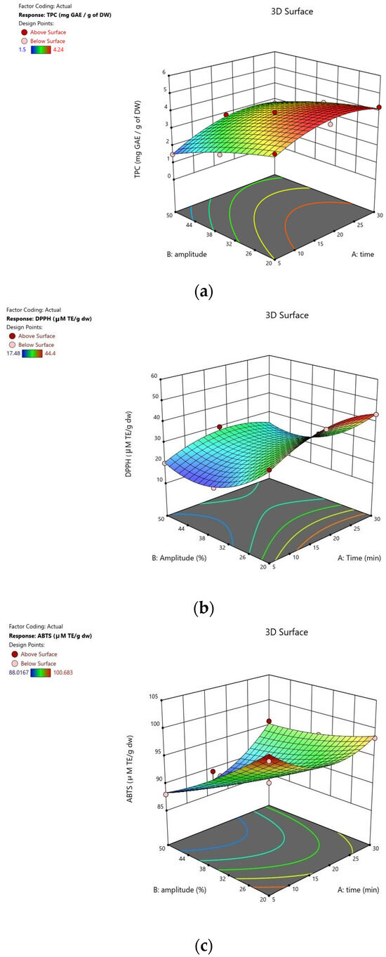 In Figure 2, a three-dimensional (3D) response surface plot is represented to show the visual effect of factors on each response, TPC (a), DPPH (b), and ABTS•+ (c) extraction yield, as well as the relationship between the two factors. From the plot, it can be concluded that increasing the amplitude negatively affected the yield of TPC (Figure 2a). This can also be concluded by Equation (1). At the same time, with the increase in the time of extraction, TPC extraction increased as well. The lowest amplitude (20%) and middle set time (17.5 min) provided the highest yield of TPC, while the lowest amplitude and highest set time were a close second.