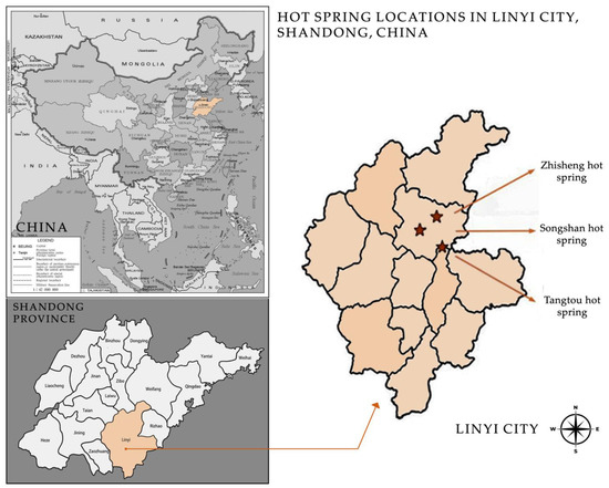Linyi City is positioned in the southern region of Shandong Province in the north eastern part of China, adjacent to the capital city of Beijing. Linyi sits atop the Yishu Fracture Zone, resulting in the emergence of hot spring water due to the compression of the earth’s crust. This unique geological feature contributes to the distinctiveness of Linyi’s hot spring landscapes. In 2011, Linyi City was designated “China’s hot spring city” by China’s Ministry of Land and Resources [44]. Linyi’s hot springs are plentiful and widely distributed throughout and around the city, making it important in terms of tourism and, consequently, a target for investment developers. It is worth noting that while Linyi city has several major hot springs, this study focuses on three significant hot spring sites, namely: Zhisheng, Songshan, and Tangtou Hot Springs (Figure 1).
