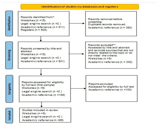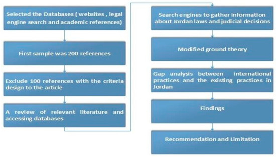 The methodology approach used in this study involved conducting a review of the relevant literature and accessing databases and search engines to gather information. The methodology outlines a structured approach to gathering and reviewing the relevant literature, conducting database and reference searches using specific keywords and utilizing various sources to collect information. The methodology involves a comprehensive search for articles, reports, and other relevant content from both Arabic and foreign sources, including scientific references, the current literature, theses, formal Jordan reports, internet sites, and electronic libraries. The researchers also utilized search engines and academic references to gather information. See Figure 1 for the PRISMA diagram.