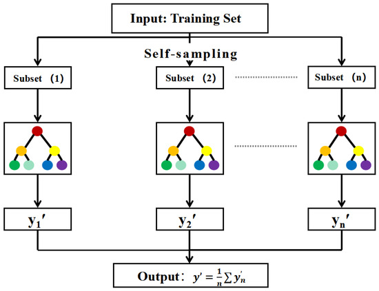 Figure 3 depicts the usage of the Random Forest algorithm in the current study. RF is an integrated algorithm that combines multiple decision trees, and the final output of its regression is the average output of all tree numbers. Randomness mainly embodies two aspects: random selection of data and random selection of features. The random selection of data is to build a data subset from the returned sampling in the original data set and use the data subset to build a sub-decision tree. This data selection method is called Bootstrap sampling. Then, random feature selection is introduced in the training process, and the optimal feature is selected from these features. This operation generates a large number of decision trees, which are unrelated to each other and each of which participates in the judgment process. Different trees are good at choosing different features, that is, the input data can be judged from different angles. Finally, the results of each decision tree are summarized to jointly determine the final output to improve the diversity of the system, thus improving the accuracy of the prediction model. RF is often used in real analysis. Compared with a single decision tree, this method can easily reduce model errors and has better generalization performance. The random forest mainly adjusts two parameters: the number of decision trees and the maximum number of features in a single tree. Because it is not sensitive to outliers in the data set and does not require too much parameter tuning, the setting of hyperparameters will not fluctuate greatly for this method. Even if default parameters are used, better results can be achieved, and it is robust.