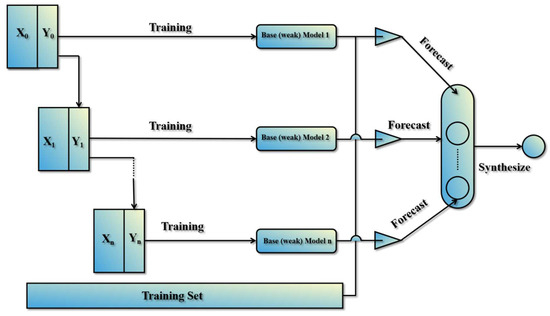 Boosting is a popular ensemble learning technique, and the Gradient Boosting Decision Trees (GBDT) is a well-known example [29]. The GBDT algorithm trains a sequence of decision trees by fitting each tree to the residual errors left by the previous trees. In this process, the overall model error is reduced, and the powerful model is then created. XGB, another boosting algorithm, was developed by Chen Tianqi and others as an open-source project to minimize model bias in supervised learning [30]. While the XGB is also a gradient boosting algorithm, it offers several improvements over the GBDT. For instance, the XGB employs a second-order Taylor expansion to calculate the objective error function (loss function), which enhances its ability to model complex relationships among variables. Additionally, the XGB introduces a regularization term in the loss function, which simplifies the model’s computations and enhances its predictive accuracy and generalization performance [31].